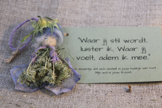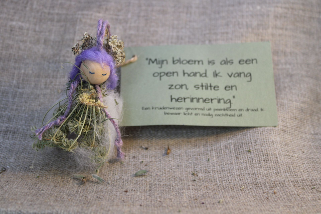 De kruidenwezentjes zijn kleine natuurfiguurtjes, geboren uit verbinding met de seizoenen, de kruiden en het moment van ontstaan. Ze zijn met de hand gevormd uit wol, bloesem en de zadenwaaier van wilde peen—een symbool van zachtheid, groei en veldkracht.